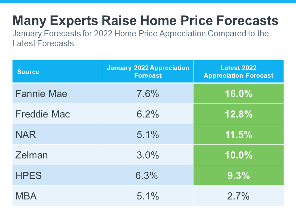 If you’re wondering if home prices are going to come down due to the cooldown in the housing market or a potential recession, here’s what you need to know. Not only are experts forecasting home prices will continue to appreciate nationwide this year, but most of them also actually increased their projections for home price appreciation from their original 2022 forecasts (shown in green in the chart below):