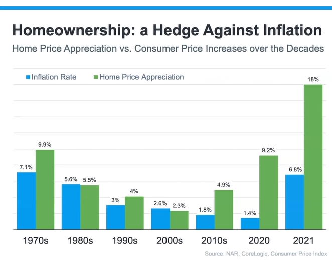 Real estate is one of the time-honored inflation hedges. Real estate is a tangible asset, and those tend to hold their value in times of increased inflation, unlike paper assets. More specifically, as prices rise, so do property values.