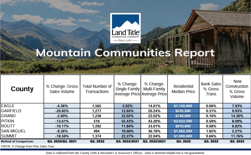 Looking only at Summit County, we are definitely seeing a slow-down in appreciation rates and in some cases (mainly in unincorporated Summit County multi-family properties) we are seeing a slight decline in prices. Overall, for the first 3 quarters of the year both Single-family and Multi-family properties are 22% higher than they were for the first 3 quarters of 2021.
