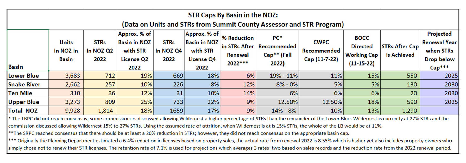 Of particular interest is the final column in Purple. This is the estimated year that the number of STR licenses will fall below the CAP and new licenses can be issued. That means that NO NEW SHORT TERM RENTAL LICENSES WILL BE ISSUED BEFORE 2025 IN THE Lower Blue and Upper Blue Basins and until 2030 in the Snake River and Ten Mile Basin. Keep in mind that Keystone and Copper Mountain can have 100% STR licenses because they are considered Resort areas.