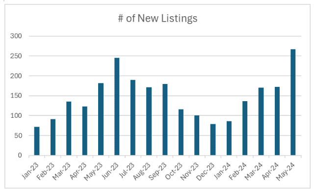 This graph shows you the number of new listings that have come on the market each month for 2023 through May 2024: