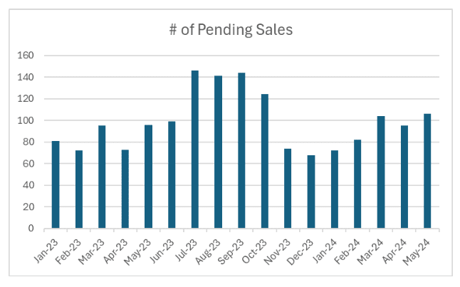The next graphic shows us the number of properties that have gone under contract (Pending Sale) each month from January 2023 through May 2024.