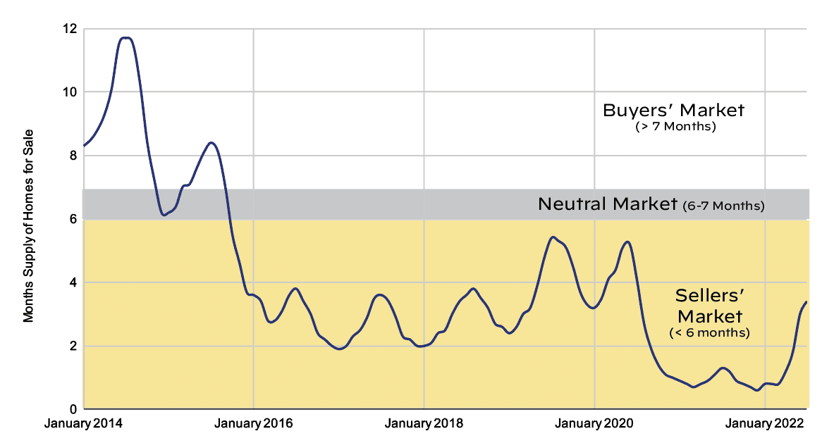 And for the past two years, we’ve been in a red-hot sellers’ market because inventory has been near record lows. The blue section of this graph highlights just how far below a neutral market inventory still is today.