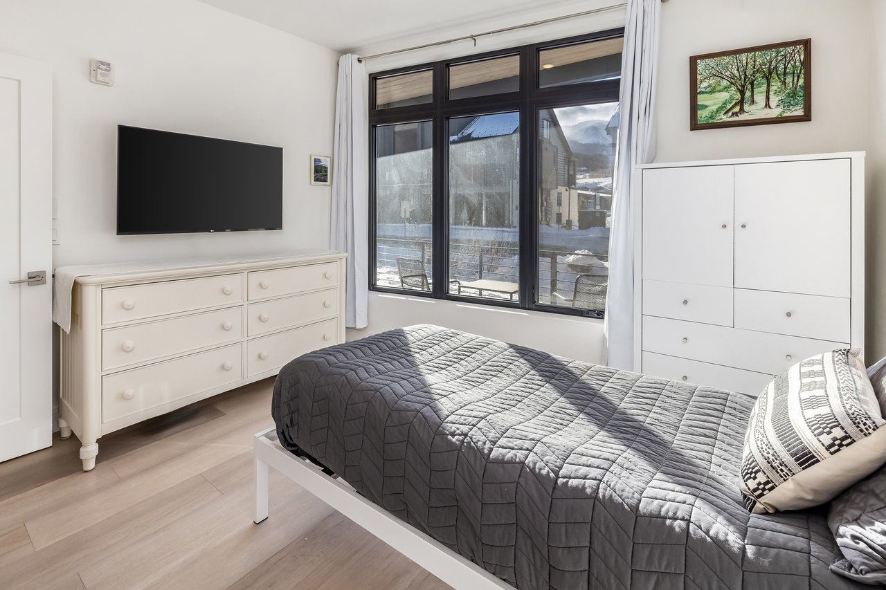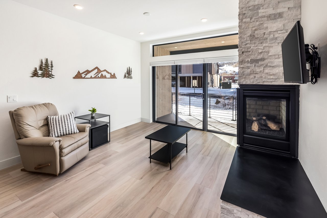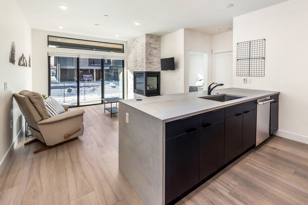 Welcome to the Rockies and your new Summit County basecamp for all your mountain adventures! Built in 2020, enjoy the modern build and finishes throughout this River West Condos. Bright wood floors and white tile contrast perfectly with the dark wood finishes of the cabinets, trim and doors. The waterfall leathered quartz countertops act a show piece in the open concept living and kitchen area. The floor to ceiling stone fireplace add to the modern style finishes, providing a warm and comfortable living area after a long day on the ski hill. Enjoy the spacious bedroom and sizable bathroom, both with matching finishes. Located within the up-and-coming town of Silverthorne, boasting growing downtown and arts culture, this property's easy access to the bike path connects it to all the town events and county ski resorts. From modern finishes to a prime location, make this River West Condo your next home in the Rocky Mountains!